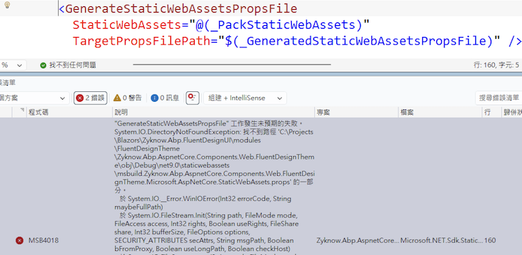 GenerateStaticWebAssetsPropsFile 工作發生未預期的失敗